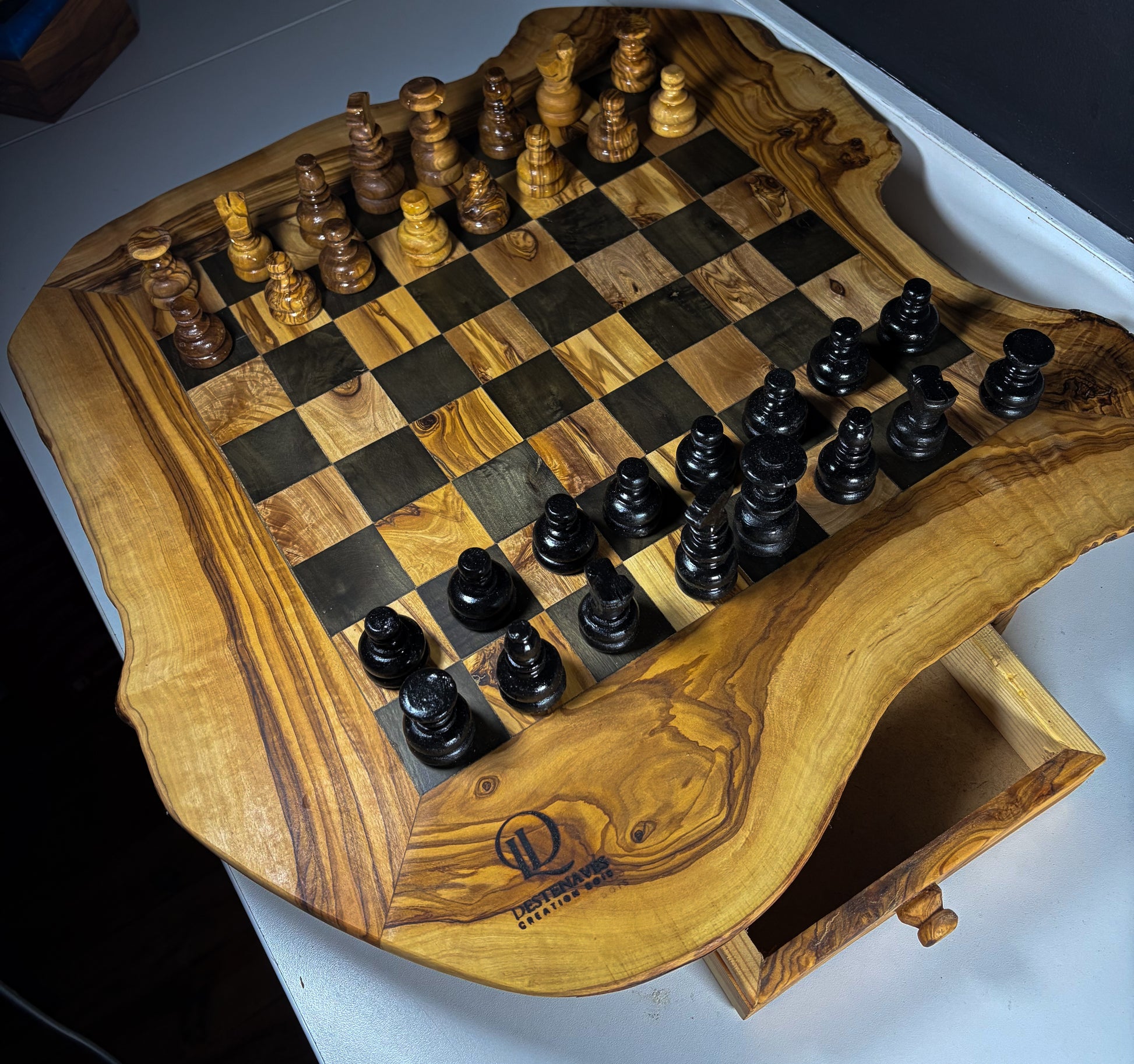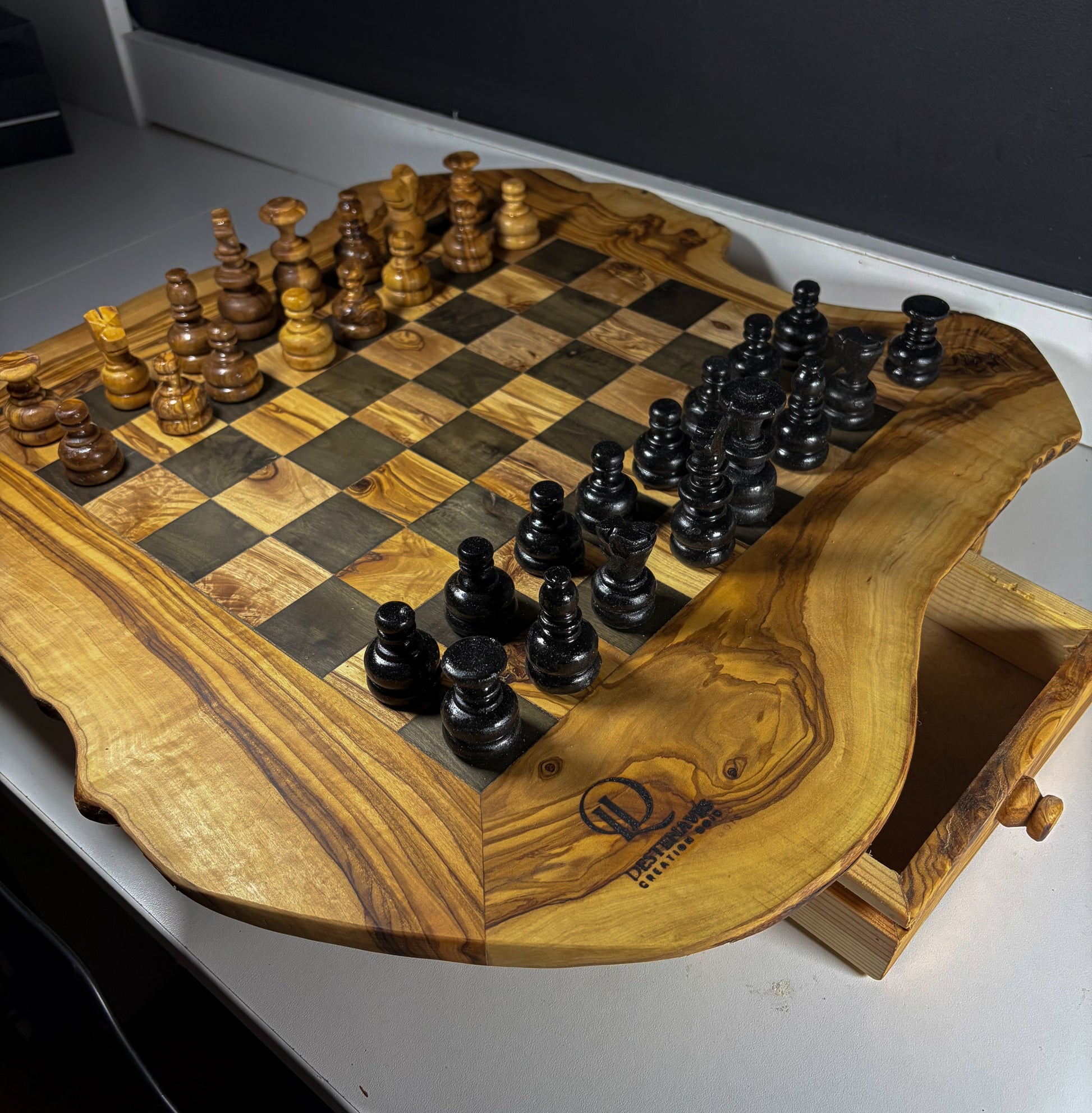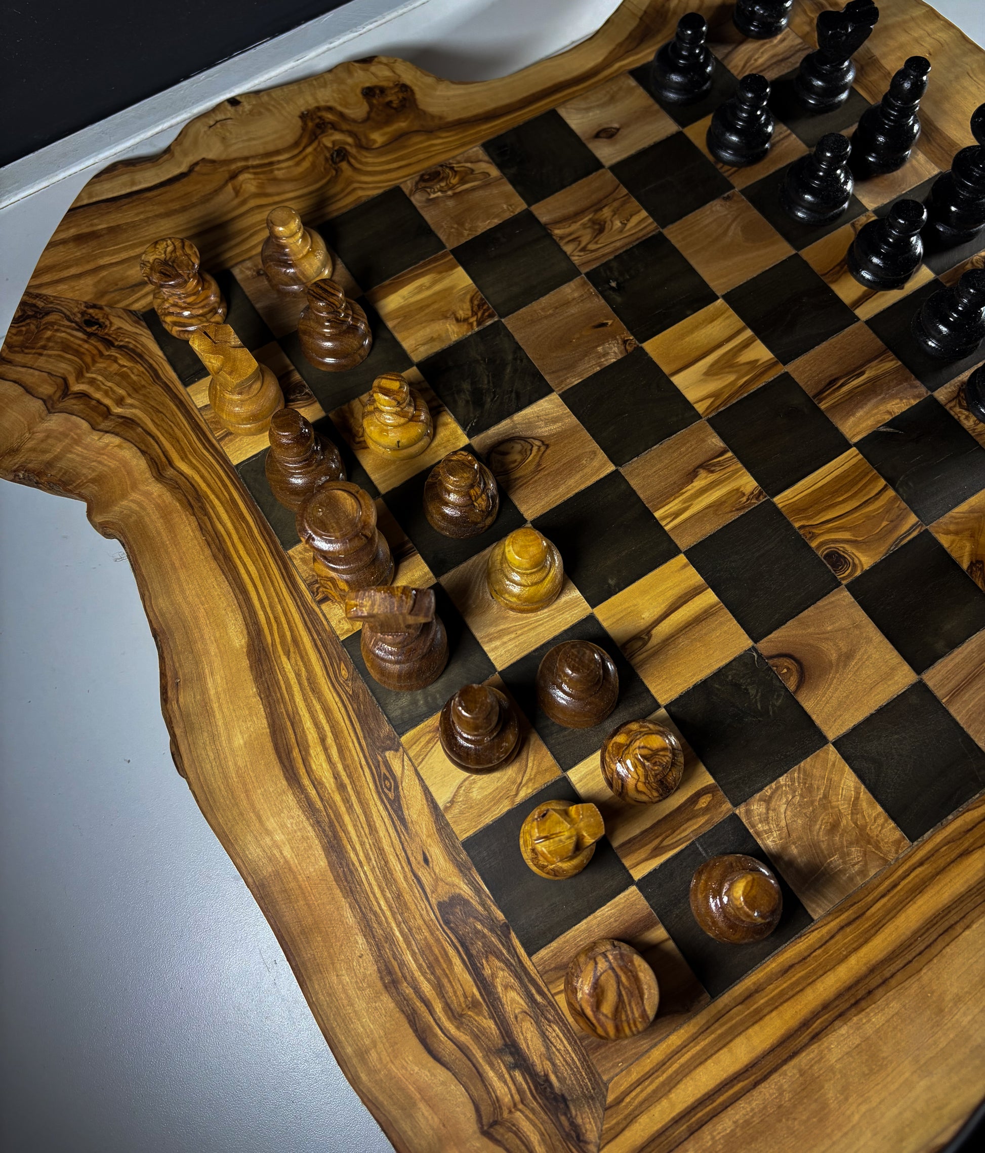 Chaque pièce est fabriquée en petite série, avec une attention particulière portée aux finitions. Les variations naturelles du bois d’olivier rendent chaque échiquier unique.